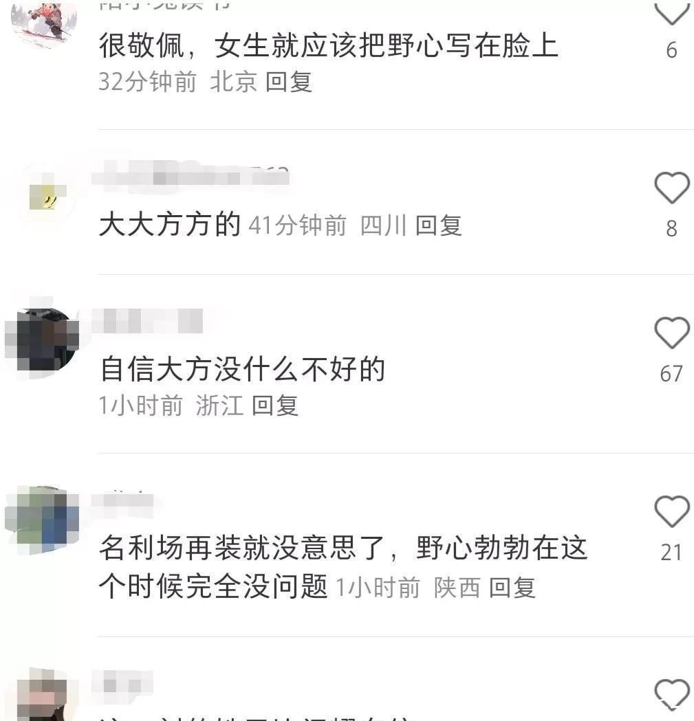 还有网友表示很佩服,这一刻的她无比闪耀自信,女生就应该把野心写在脸上,大大方方的争取机会没有什么不好。