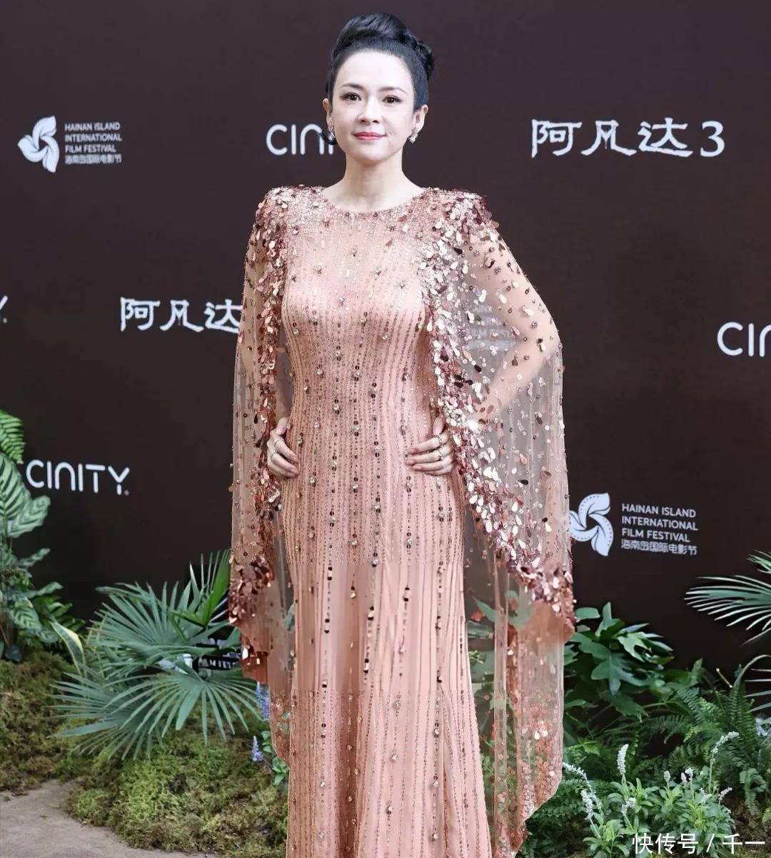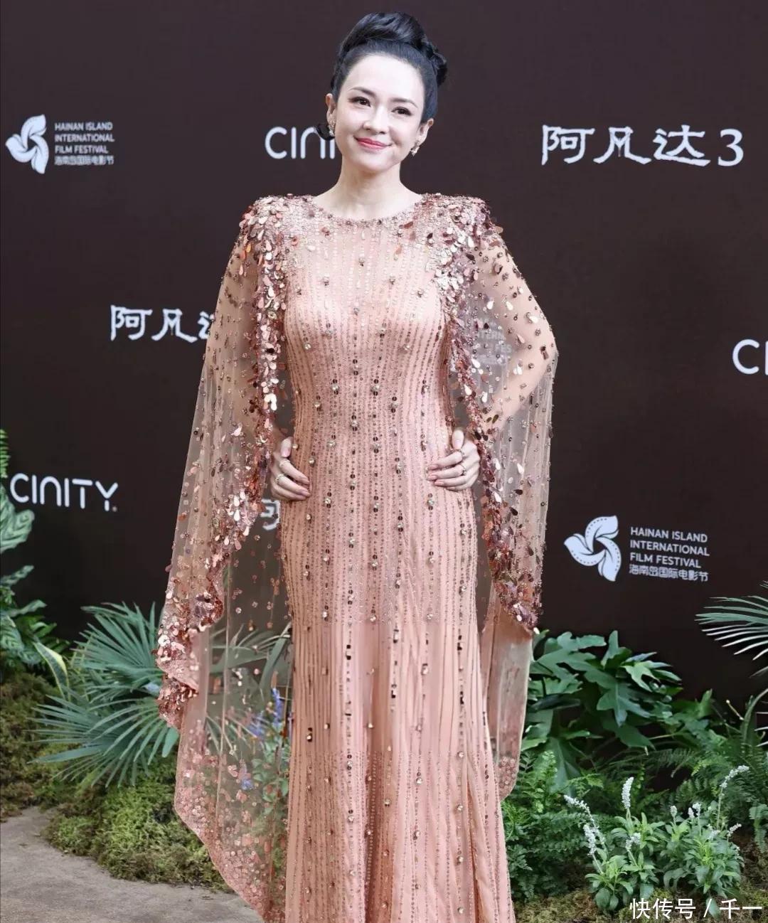 她穿着一袭亮片斗篷式的浅粉色长裙,头发高高的盘起来,妆容精致。整个人往活动现场那一站,雍容又华贵。
