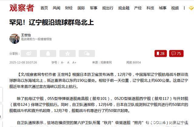 日本这次是真的踢到钢板了, 日方前脚还在就日本战机被雷达照射一事对中方提出强烈抗议,后脚辽宁舰就来到了日本家门口。 据观察者网12月8日的报道,日本防务省发布的最新消息显示, 中国辽宁舰航母战斗群在12月7日当天沿琉球群岛一路北上,到达了距离日本本土仅370余公里的喜界岛以东190公里处。