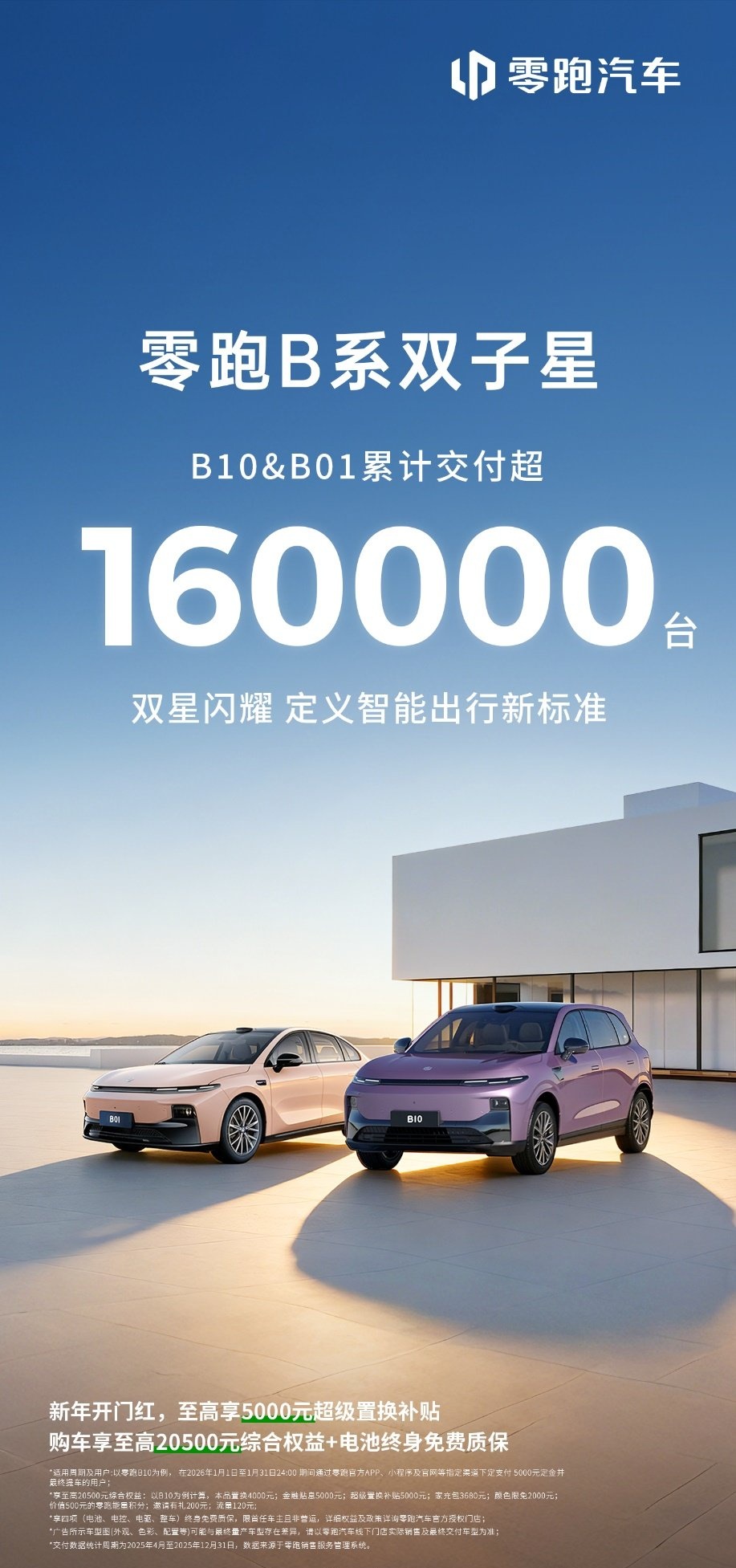 IT之家 1 月 4 日消息,零跑汽车今日宣布,B 系列(B10、B01)累计销量突破 16 万辆,创品牌最快交付纪录。同时,零跑针对 B 系列车型推出专属优惠活动,即日起至 1 月 31 日,订购 B 系列的用户可享至高 5000 元限时补贴。