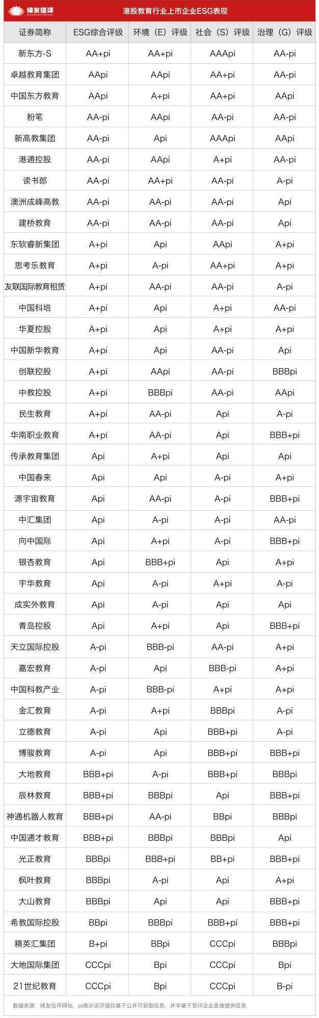 中国财富网讯r教育行业作为赋能人才成长、助力社会进步的核心领域,既是知识传承的重要载体,也肩负着可持续发展的社会责任。近日,海南绿色发展信用评级有限公司(以下简称“绿发信评”)发布A股和港股上市公司ESG主动评级结果,全面勾勒了行业ESG发展图景:ESG已成为驱动教育行业高质量发展的关键力量,推动行业向绿色运营、责任育人、规范治理的方向稳步迈进。港股教育企业整体评级集中、多维表现均衡,A股企业则呈现分化态势,头部企业有亮点但部分维度存在短板。