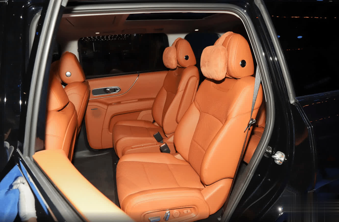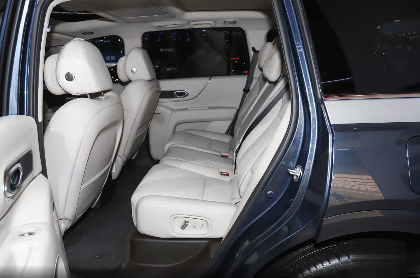比较有意思的是后排空间处理,这款车甚至提供有第2排单独的车顶折叠大电视,这种思路已经比较接近一些主流的豪华MPV,所以选择6座版本就很舒服了,特别是2+2+2的布局第2排有两个独立座椅。