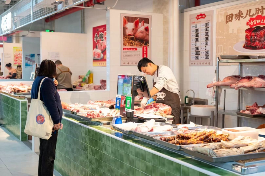 “免费代加工香肠、走油肉、走油蹄髈”,小鲍肉铺的大幅广告吸引了不少客人。切片、拌料、绞肉、灌肠、打孔、打结……在摊主小鲍的娴熟操作下,一根根香肠很快就加工完成。“只要在我们这里买肉,就能免费加工。”他说,临近春节,代加工需求十分旺盛,增值服务不仅能促进消费,也能让大家在便捷中享受传统年味。