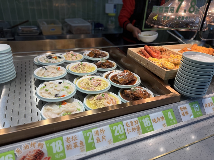 走出羊肉店,旁边就是熟食区。一边是生煎、羌饼、油条、豆浆等老上海点心,一边是烤鸭、卤肉、排条、熏鱼等几十种现制熟食,一字摆开,琳琅满目,为市民三餐添上新滋味。